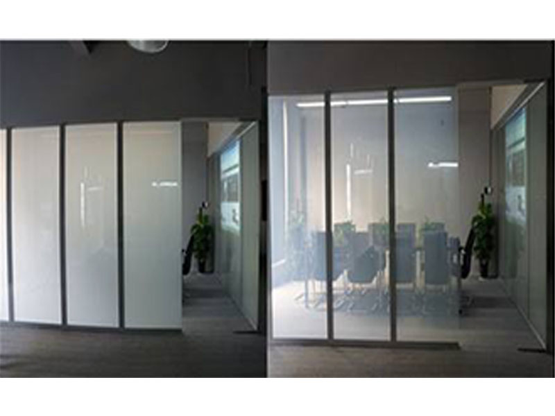 当调光玻璃关闭电源时,电控调光玻璃里面的液晶分子会呈现不规则的散布状态,此时电控玻璃呈现透光而不透明的外观状态;当给调光玻璃通电后,里面的液晶分子呈现整齐排列,光线可以自由穿透,此时调光玻璃瞬间呈现透明状态。